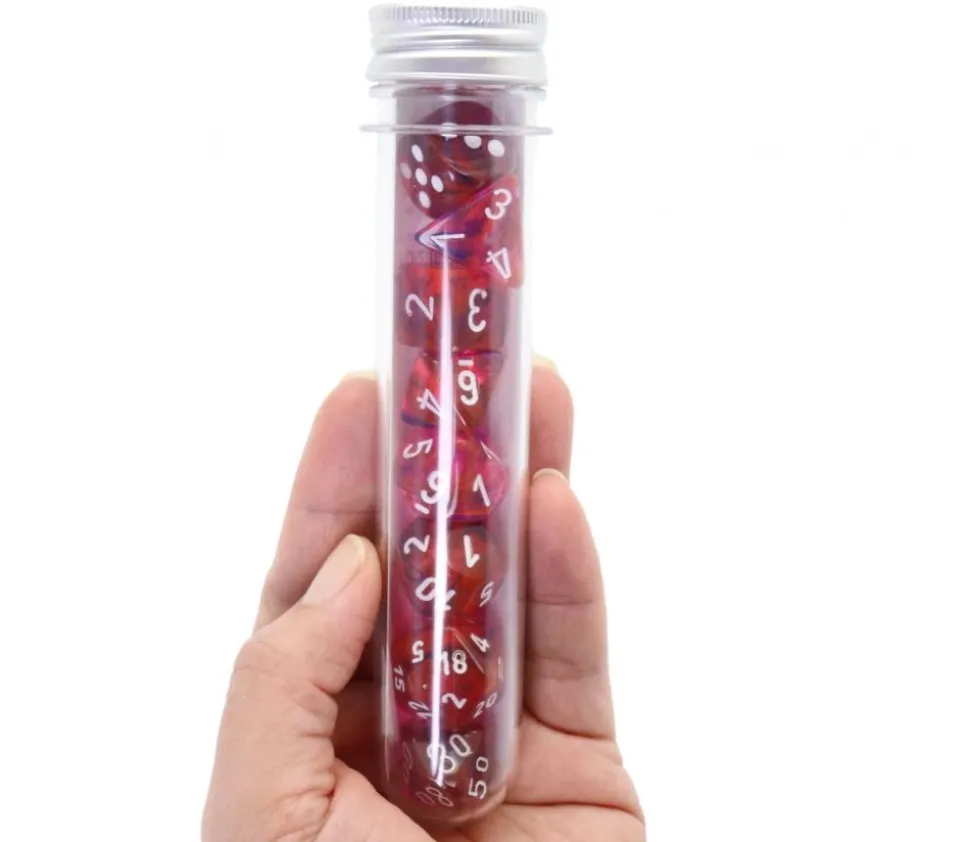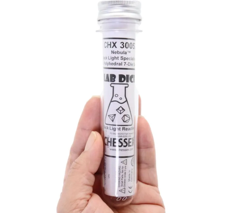 Tube en édition limitée avec 7 dés multifaces avec le marquage standard et 1 dé bonus spécial avec 1 face « potion ».