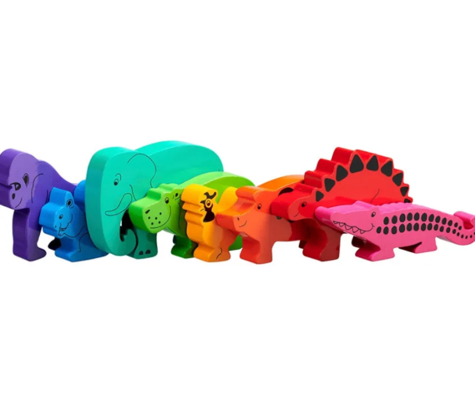 Gros animaux en bois issu du commerce équitable. Ce set comprend 8 animaux sauvages aux couleurs de l’arc en ciel parmi différents animaux. La répartition des animaux est aléatoire dans un lot : gorille, éléphant, hippopotame, crocodile, écureuil, mouton, dinosaure, suricate, coq, girage, renard, âne, cygne ou autres.