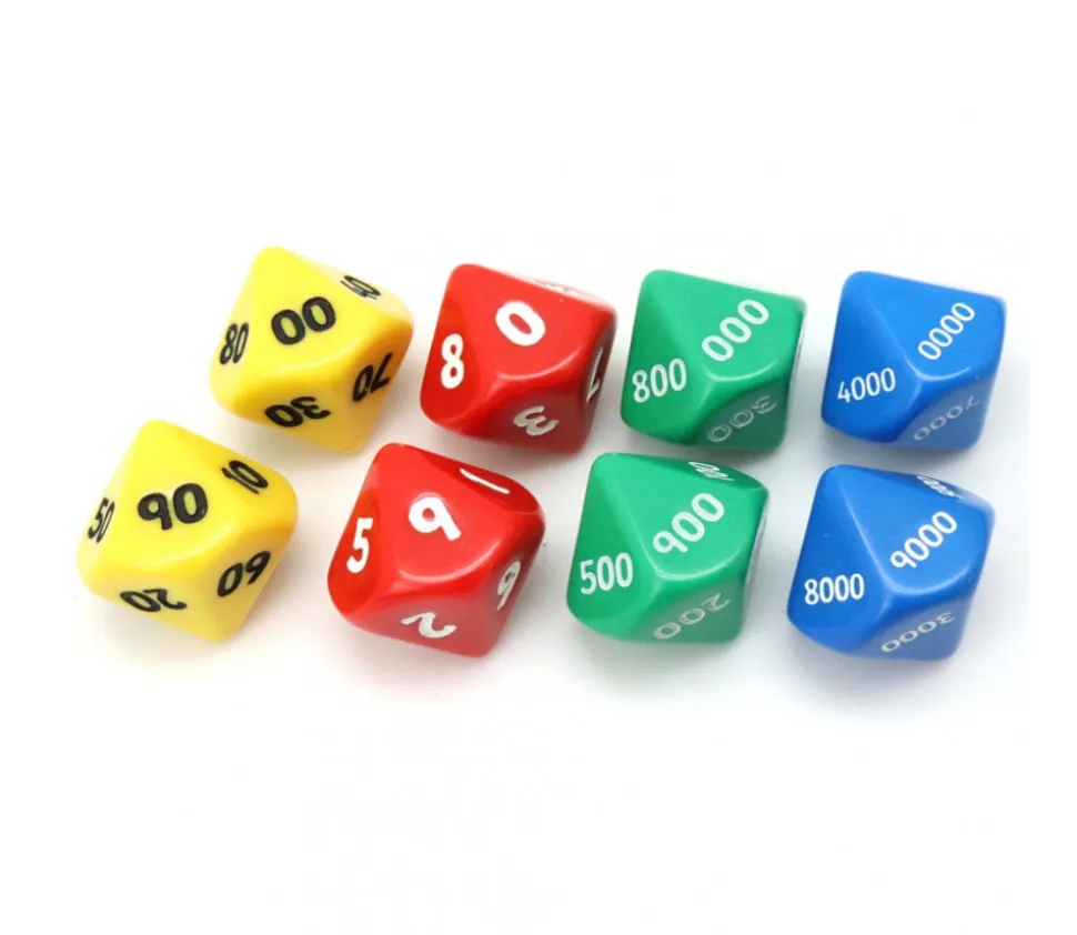 8 grands dés valeurs mathématiques 10 faces : 2 dés unités, 2 dés dizaines, 2 dés centaine, 2 dés milliers. Dés taille jumbo de 3 cm de diamètre. Dé pour exercices mathématiques