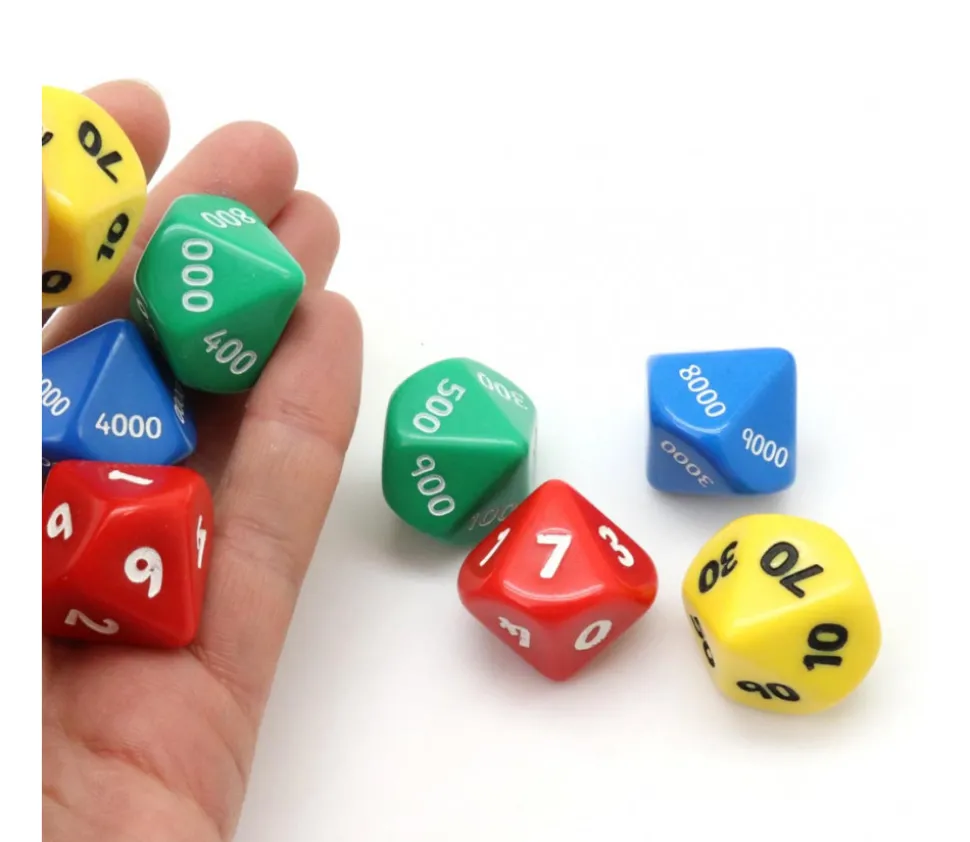 Lot de 8 grands dés mathématiques à 10 faces de 3 cm de diamètre.