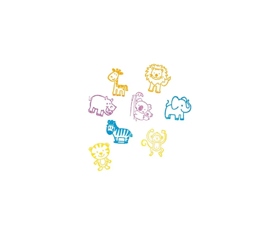 Set de 8 tampons avec des petits dessins sur le thème des animaux et 4 tampons encreurs colorés.