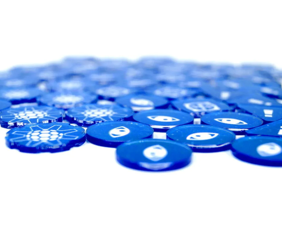 Jetons en plexiglas transparent de 2 mm d’épaisseur, imprimés sur une face et visible sur l’autre par transparence.