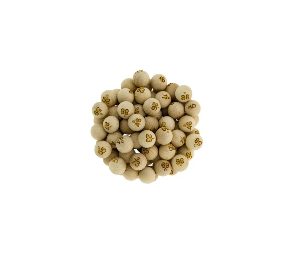 90 boules en bois avec chiffres gravés de 1 à 90 pour jouer au jeu de loto.