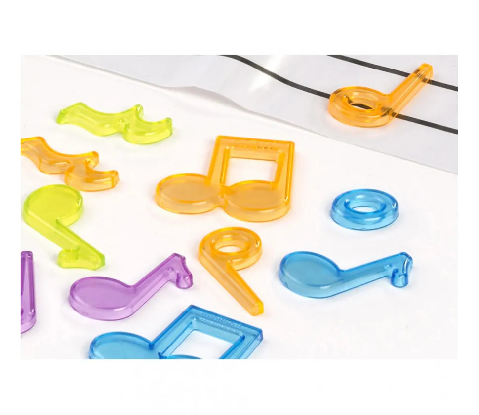 96 notes et symboles de musique en plastique translucide coloré avec 1 feuille de portée transparente. Notes et symboles en couleurs de 4 cm de hauteur à positionner sur la portée en clé de sol. Pour débuter l’éducation musicale avec les notes et les symboles.