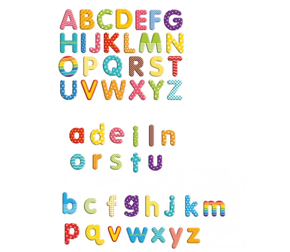 99 lettres magnétiques multicolores : 26 lettres majuscules et 73 lettres minuscules (certaines lettres sont doublées et d’autres quadruplées pour faciliter la construction des mots). Lettres colorées avec une hauteur approximative de 4.5 cm. Multicolores, matériel éducatif pour jeu, apprentissage, tableau aimanté, ardoise…