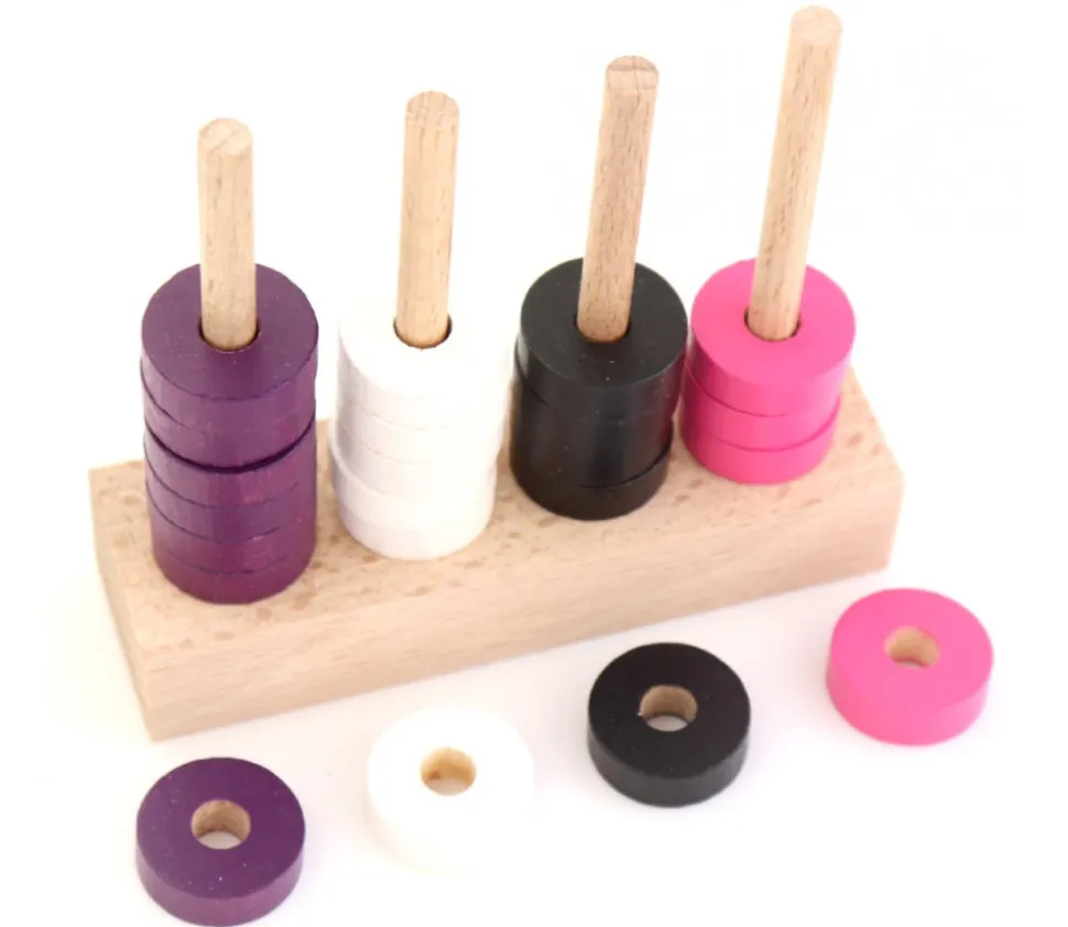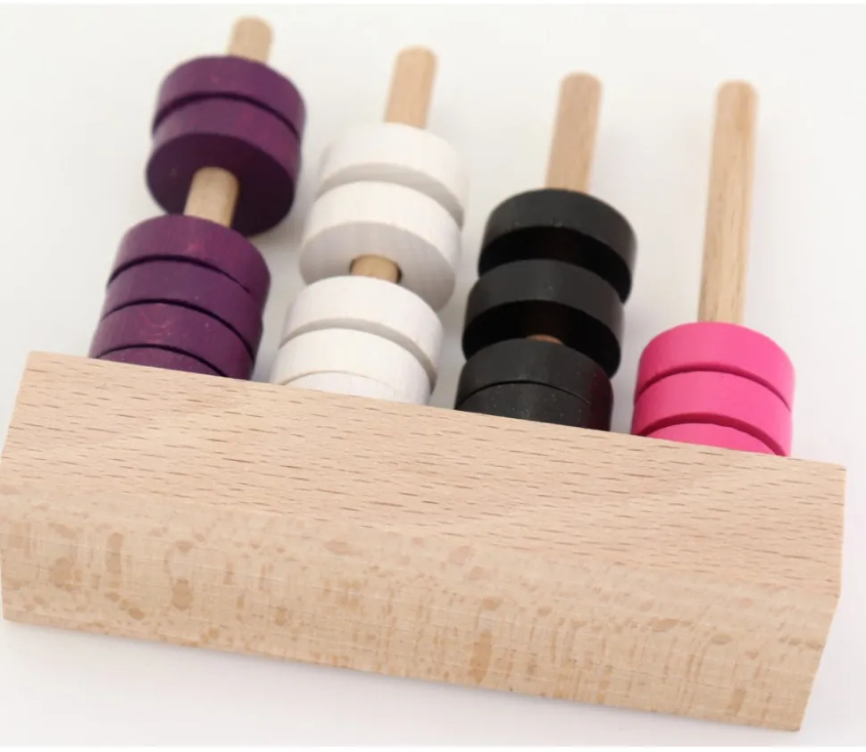 Socle Abaque en bois avec 4 trous qui vous permettent de fixer 4 tiges. Vous pouvez y mettre au choix 4 tiges de taille identique. Socle en bois résistant de 10 cm + 4 tiges fournies (4 tiges de 8 cm). Fabrication France. Support de jeux pour enfiler des jetons de jeu non fournis.