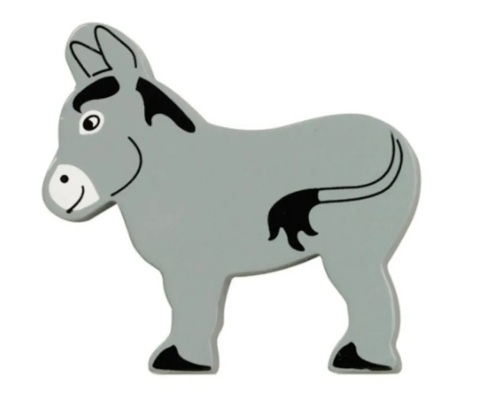 Pion âne en bois. Pion de jeu en bois très réaliste peint recto et verso. Petit âne en bois sympathique de 74 x 80 x 15 mm. Animal de ferme pour jouer. Joli petit âne gris. Pion de jeux de société ou jouet pour créer un mini monde. Petit âne à combiner avec d »autres animaux pour création de mini ferme en bois avec ses jouets issus du commerce équitable.