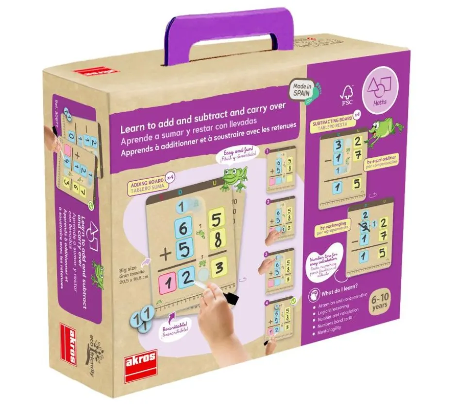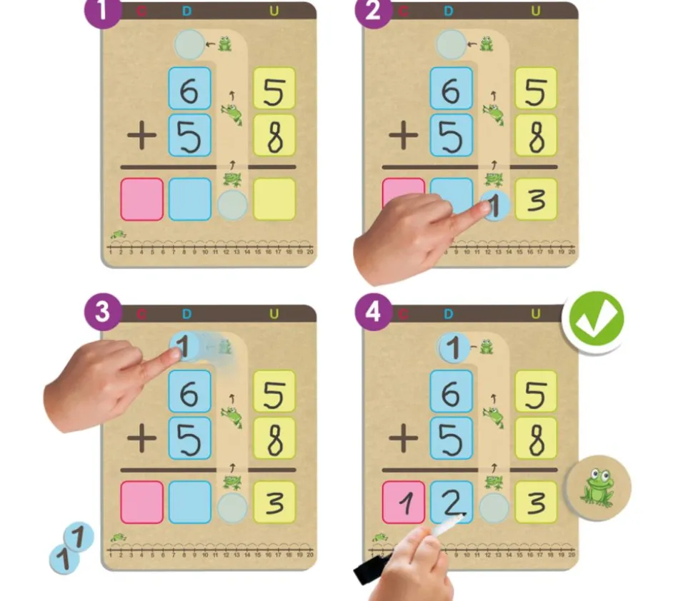 Le jeu contient 8 planches effaçables pour pratiquer autant de fois que vous le souhaitez. Il y a une ligne numérique à la base pour faciliter les calculs. Le jeu contient deux systèmes pour effectuer la soustraction avec retenue, par compensation et par emprunt.