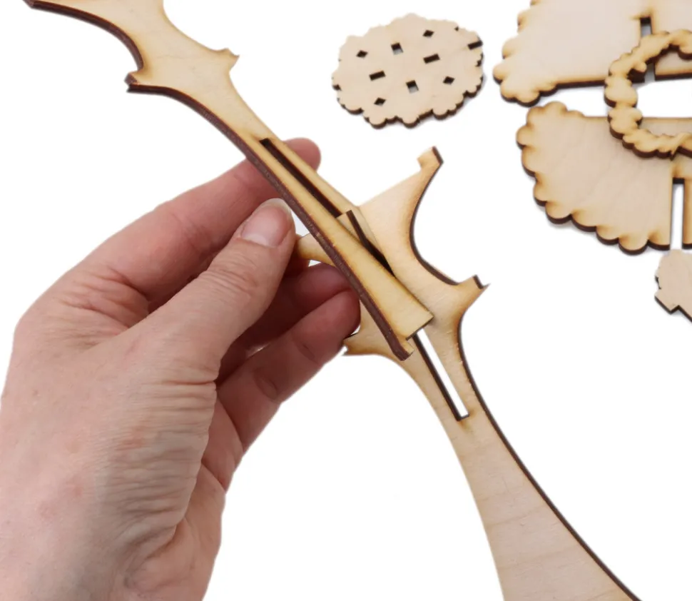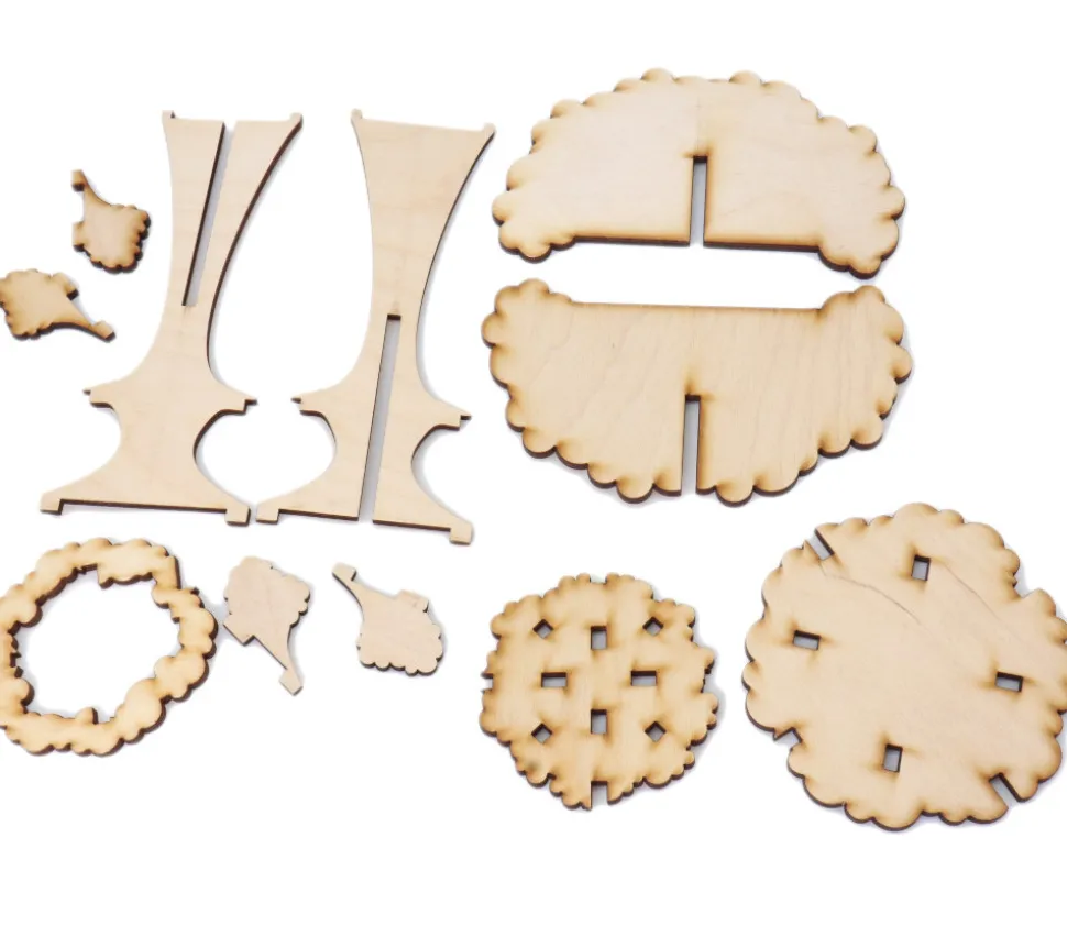 Composition : 11 pièces prédécoupées en contreplaqué à assembler. Vous pourrez vous aider des photos des différentes étapes de montage 😉