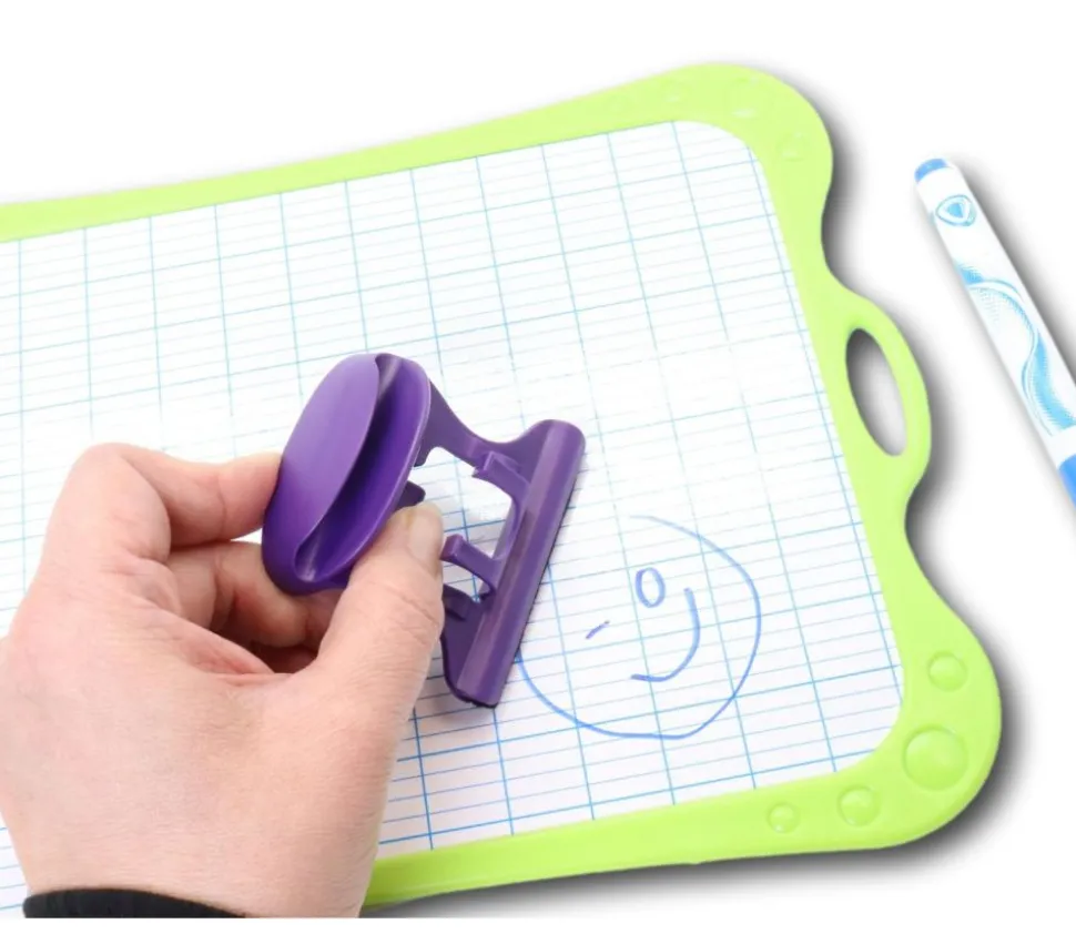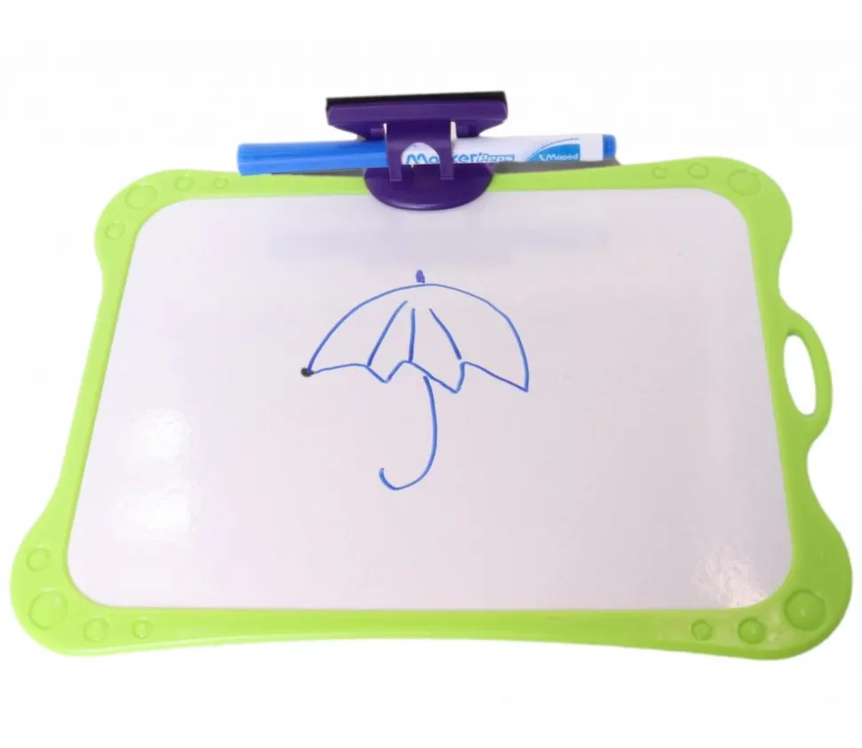 Ardoise effaçable recto avec un grande grille tableau cases de 17 x 17 mm et marquage des lignes pour écrire les lettres ou les chiffres et verso tout blanche pour dessiner.