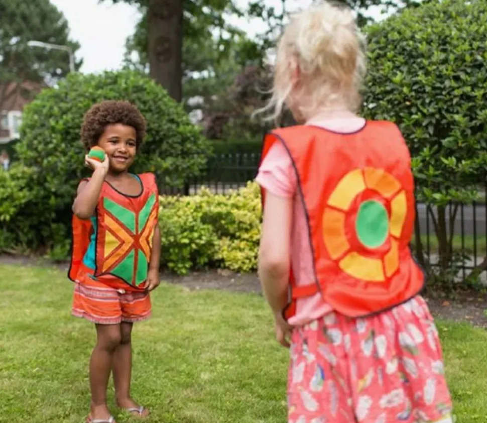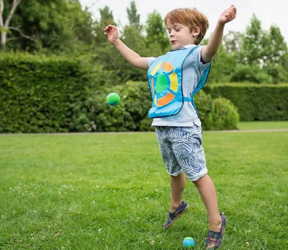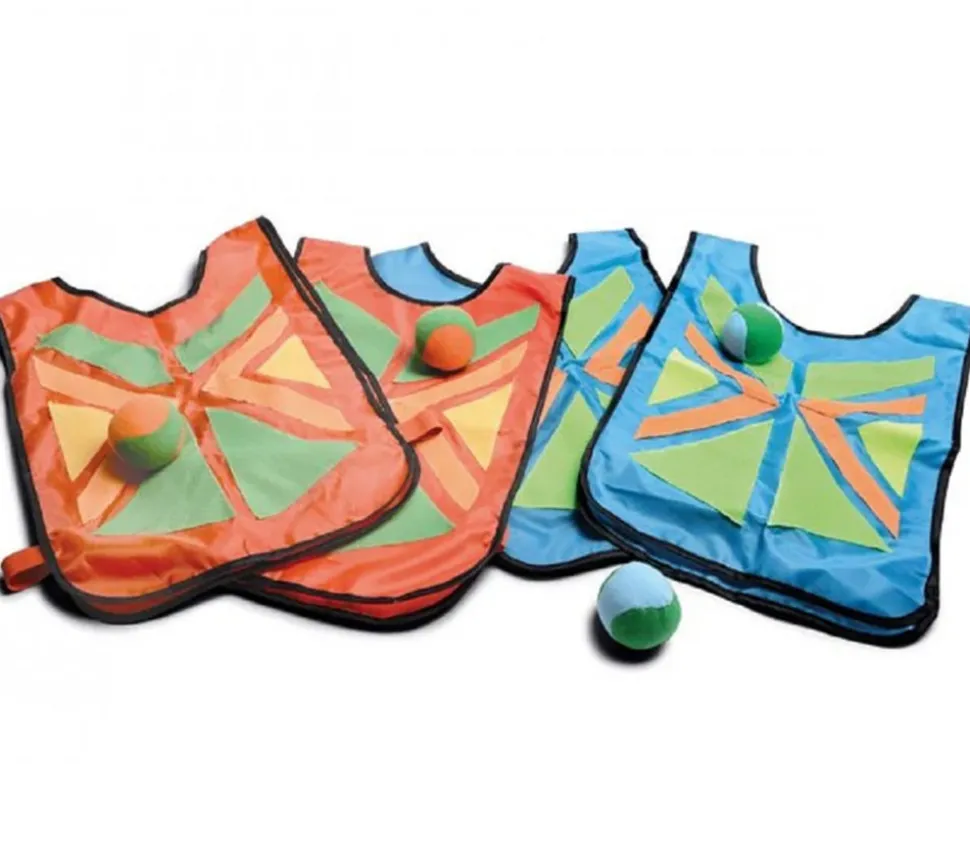 Set de 4 gilets avec parties en velcro pour balle agrippante sur le ventre et sur le dos. Jeu de coordination et d’adresse pour jouer à l’école et dans le jardin. Balles légères, sans danger pour les lancer. Activité sportive de plein air sympa et originale.