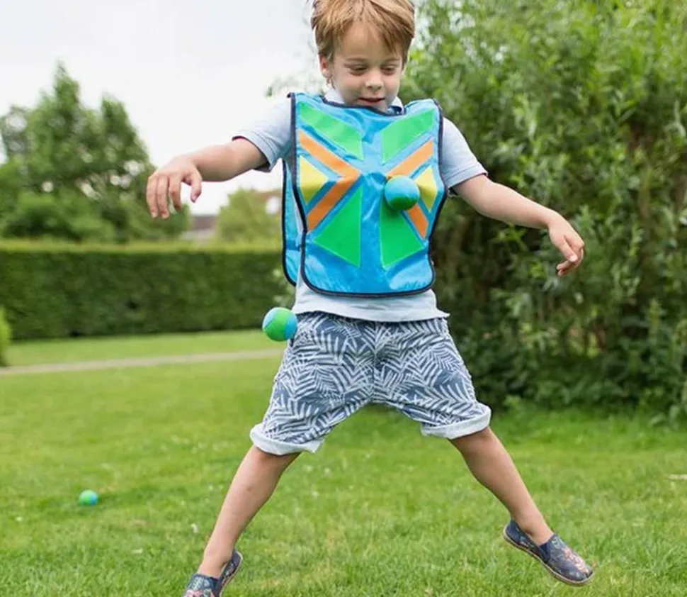 4 dossards enfants avec pièces en velcro scratch et 4 balles à lancer. Jeu de plein air idéal pour jouer à lancer dans le jardin ou parc. Un set pour jouer pour deux à quatre joueurs. C’est amusant d’attraper les balles avec son ventre ou son dos et d’éviter que l’autre joueur réussisse à nous atteindre. Jouet sportif fun pour faire se dépenser les enfants. Set pour joueurs de 4 ans et plus. Attention ! Il faut bien viser !