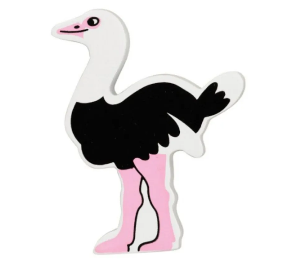 Pion autruche en bois. Pion de jeu en bois très réaliste peint recto et verso. Petite autruche en bois avec son oeil malicieux. Dimensions 54 x 73 x 15 mm. Animal de la savane peint en noir, blanc et rose . Pion de jeux de société ou jouet pour créer un mini monde. A combiner avec d »autres animaux pour création de mini zoo en bois avec ses jouets issus du commerce équitable.