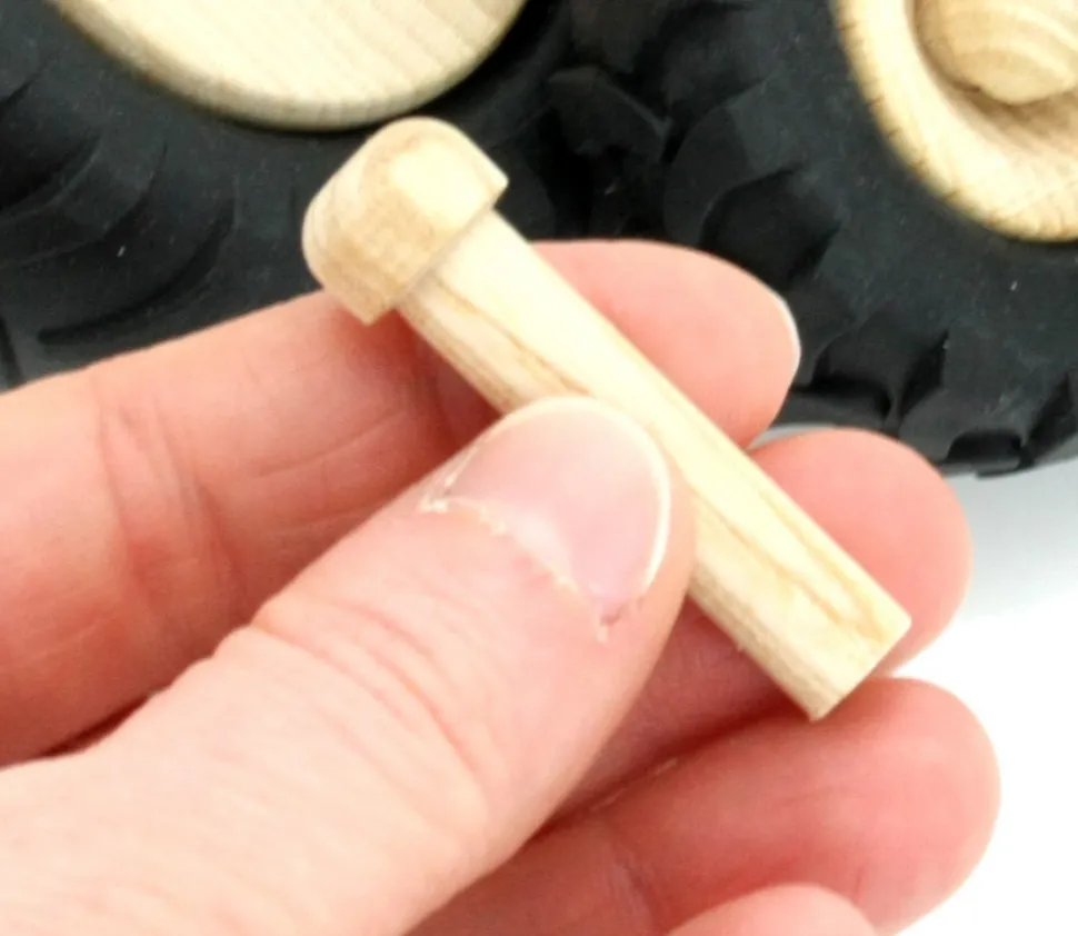 Tenon en bois pour roue de tracteur. Axe corps d’essieu pour positionner vos roues et créer vos jeux, jouets ou petites voitures. Accessoires de construction pour réaliser vos jouets en bois facilement. Pour maquettes et miniatures. Tenon en hêtre avec une tête de 12 mm et une base de 8 mm et la longueur est de 40 mm. Pivot pour roue. Livré sans roue qui sont vendues séparément.
