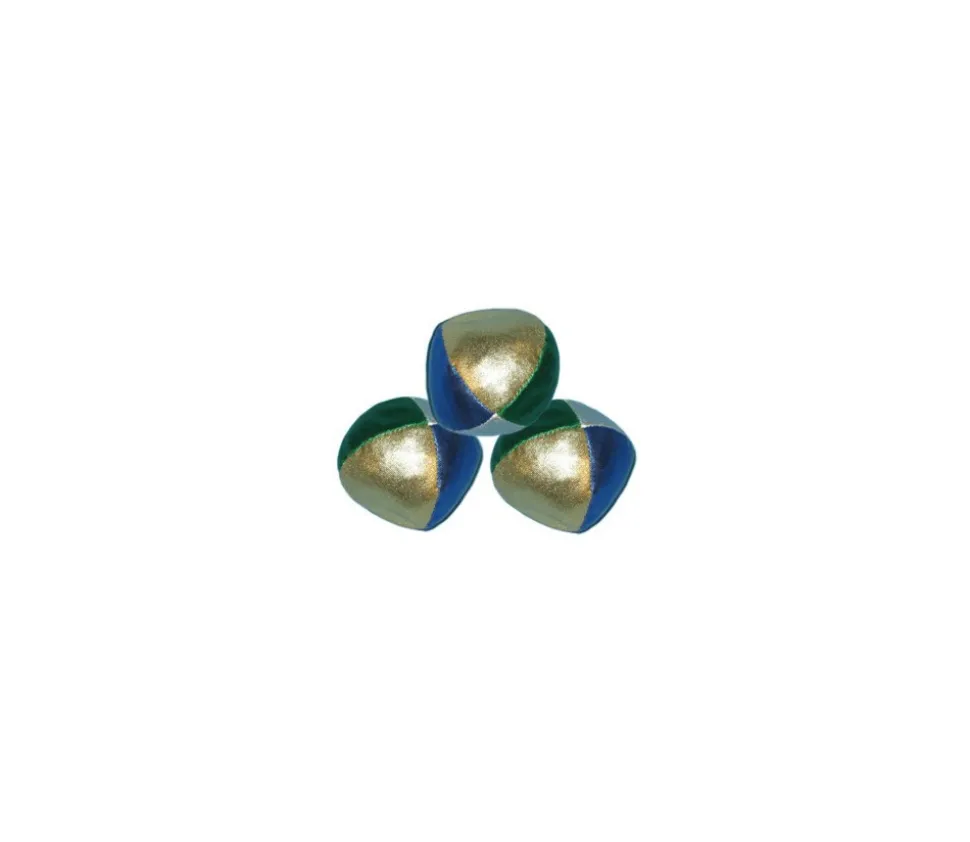 Lot de 3 balles de jonglage dorées de diamètre 6.5 cm. Balle brillante avec 4 couleurs sur la balle: bleu, vert, doré, argenté. Poids de 55 g.