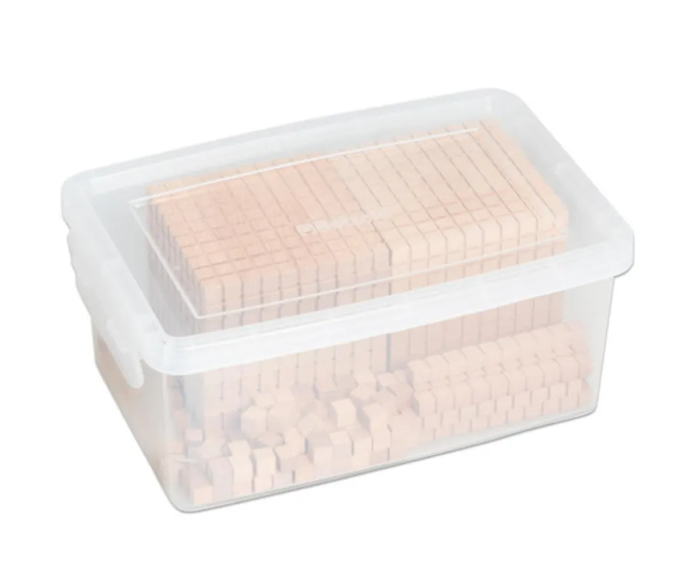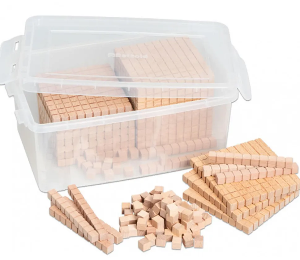 Ce Kit comprend environ 100 pièces unités de 1x1x1 cm, 10 baguettes dizaines 10x1x1 cm, 10 plaques de centaines et 1 gros cube millier de 10 x 10 x 10 cm. Chaque pièce est sectionnée en cube unité pour faciliter le comptage par les enfants.