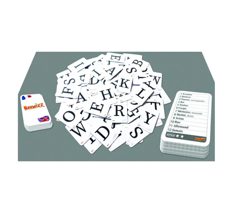 BEEWIZ, l’anglais en jeu. Jeu de société amusant pour apprendre facilement le vocabulaire anglais. Avec 3 niveaux de difficulté, ce jeu est idéal pour découvrir les mots du quotidien en anglais. Déroulement du jeu : chaque joueur reçoit un mot au hasard. Tous les autres joueurs doivent piocher le plus vite possible dans le tas de lettres pour trouver leur traduction respective. Jeu pour les enfants à partir de 8 ans et les adultes qui veulent réviser et apprendre l’anglais.