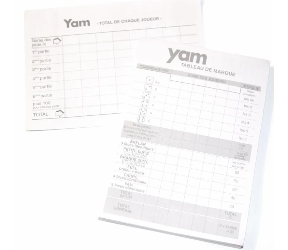 Dimensions du bloc : 10.5 x 14.5 cm. Bloc avec environ 50 feuilles de score de yam’s. Score pour joueur de 1 à 6 joueurs.