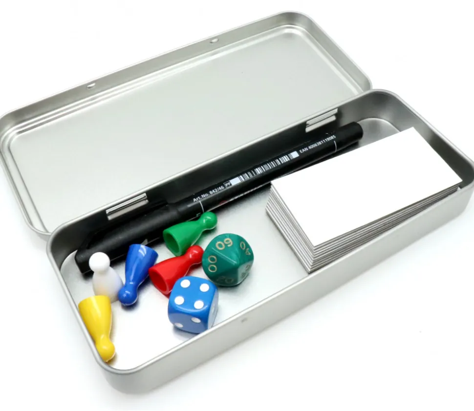 Jolie boite à crayon en métal. Idéale pour ranger tous vos petits accessoires de jeux, pions, dés, jetons, feutres, crayons, cartes à jouer…