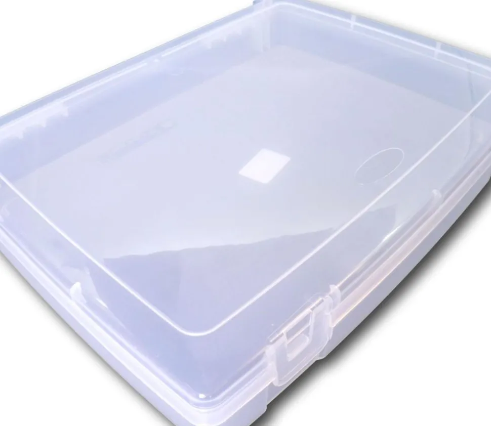 Boite valise en plastique rigide grand format. Grande boite en plastique de taille un peu plus grand que A4 pour ranger facilement catalogues, plateaux de jeux, cahiers ou feuilles avec d’autres accessoires.