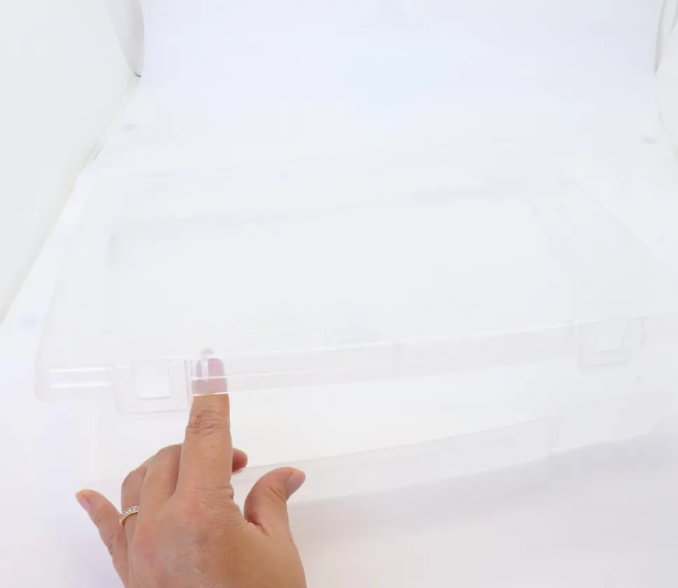 Boite transparente avec couvercle intégré. Accessoire de rangement ultra-pratique.
