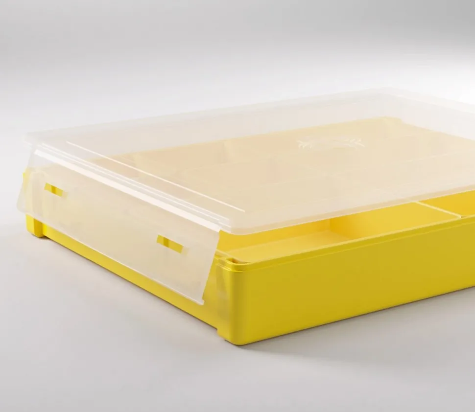 Cette boite proche A5 comprend 9 casiers plastiques colorés :