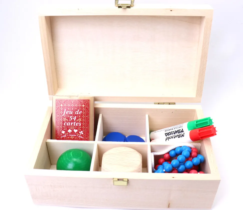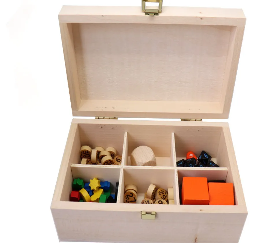 Boite de rangement 6 compartiments en bois de tilleul naturel brut. Boite pour ranger facilement et trier vos accessoires de jeux de société ou petits matériels de loisirs créatifs.