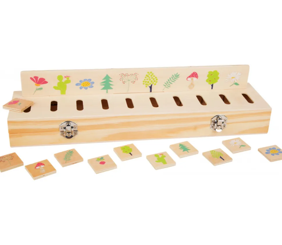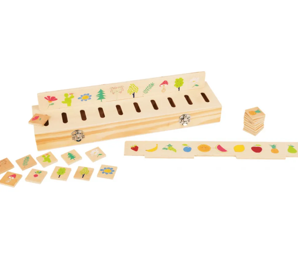 Jeu mémo en bois pour apprendre à reconnaitre les éléments de la nature : animaux, les fruits, les légumes, les arbres…