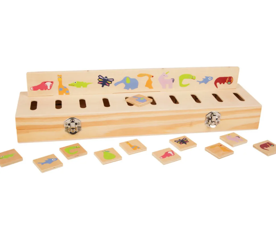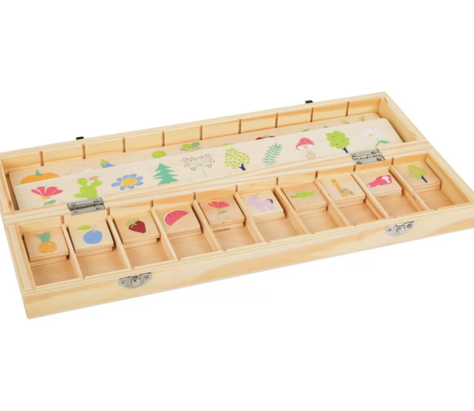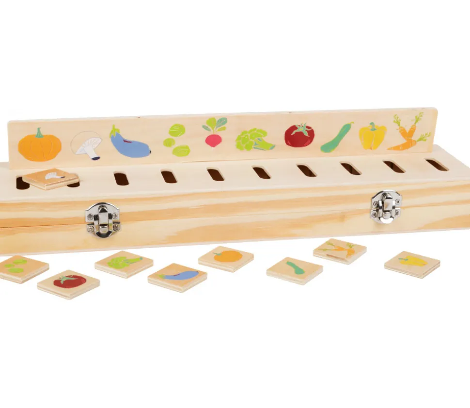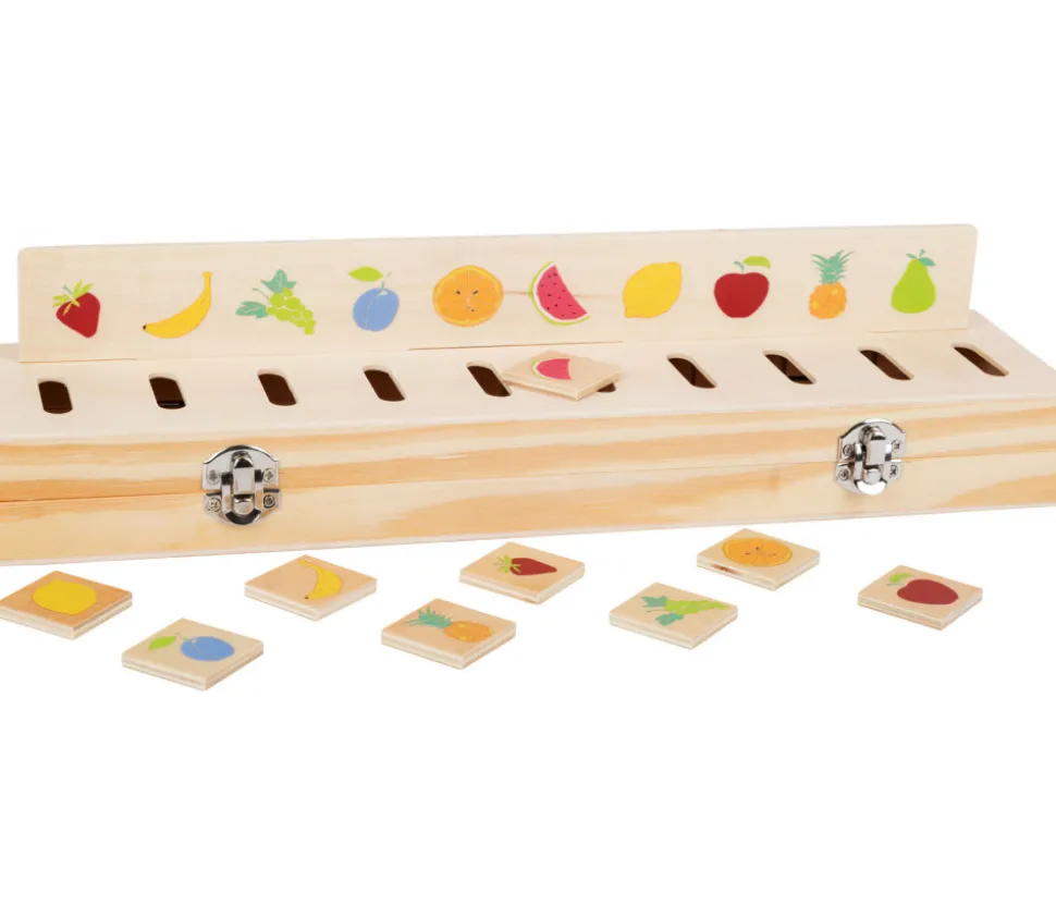 Très joli jeu mémo en bois pour apprendre à reconnaitre les animaux, les légumes, les fruits… Jeu en bois éducatif de qualité. Tuiles et réglette imprimées des 2 côtés.