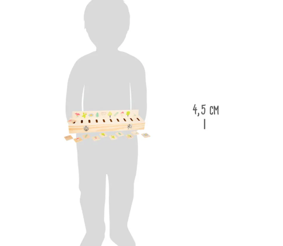 Boite de tri avec des jetons à faire glisser dans les fentes correspondants aux images correspondantes. Plusieurs manières de jouer : jeu d’association image, association couleur, mémo visuel. 4 thèmes : fruits, légume, animaux et arbres. Pour chaque séquence, vous possédez une réglette avec les images, les enfants doivent positionner les jetons images identiques dans la fente correspondante. Autocorrecteur, une fois le jeu terminé, l’enfant ouvre le jeu et peut vérifier si tout est correct.