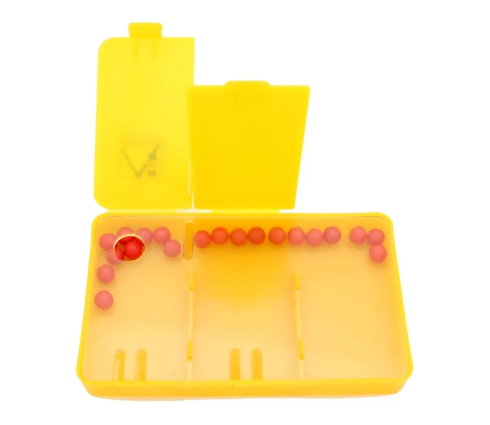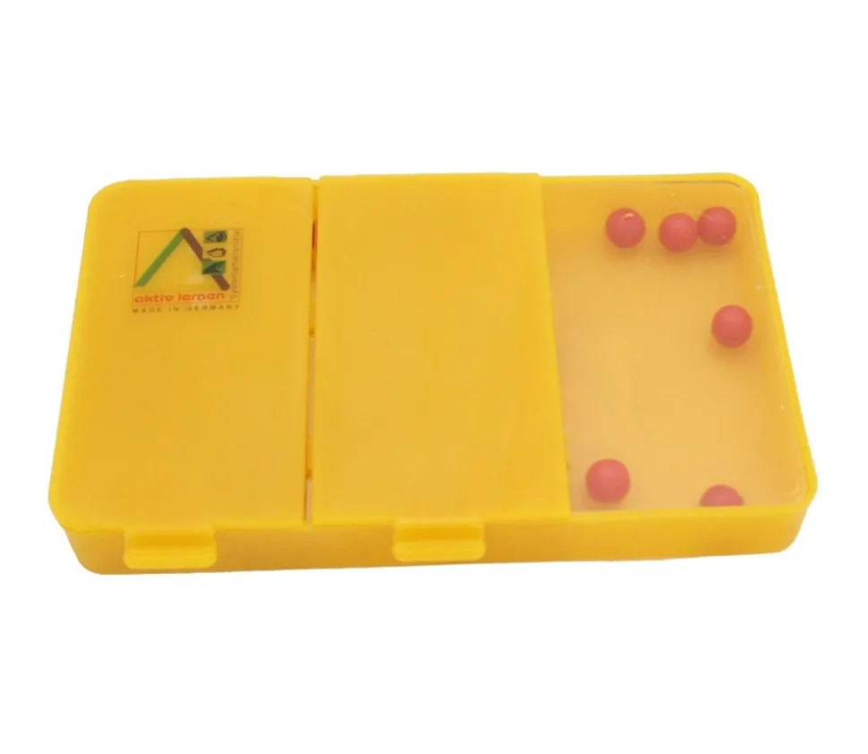Boite à compter de répartition 12.3 x 8 cm avec billes pour compter et réaliser des opérations mathématiques plus facilement. Boite avec 3 compartiments et 20 billes. On remplit la boite avec le nombre de billes souhaitées. Par exemple, on met 10 billes, on ferme et on secoue. On ouvre un couvercle, on a donc deux nombres de boules, par exemple 5 et 2, combien reste-t-il dans la dernière case ?