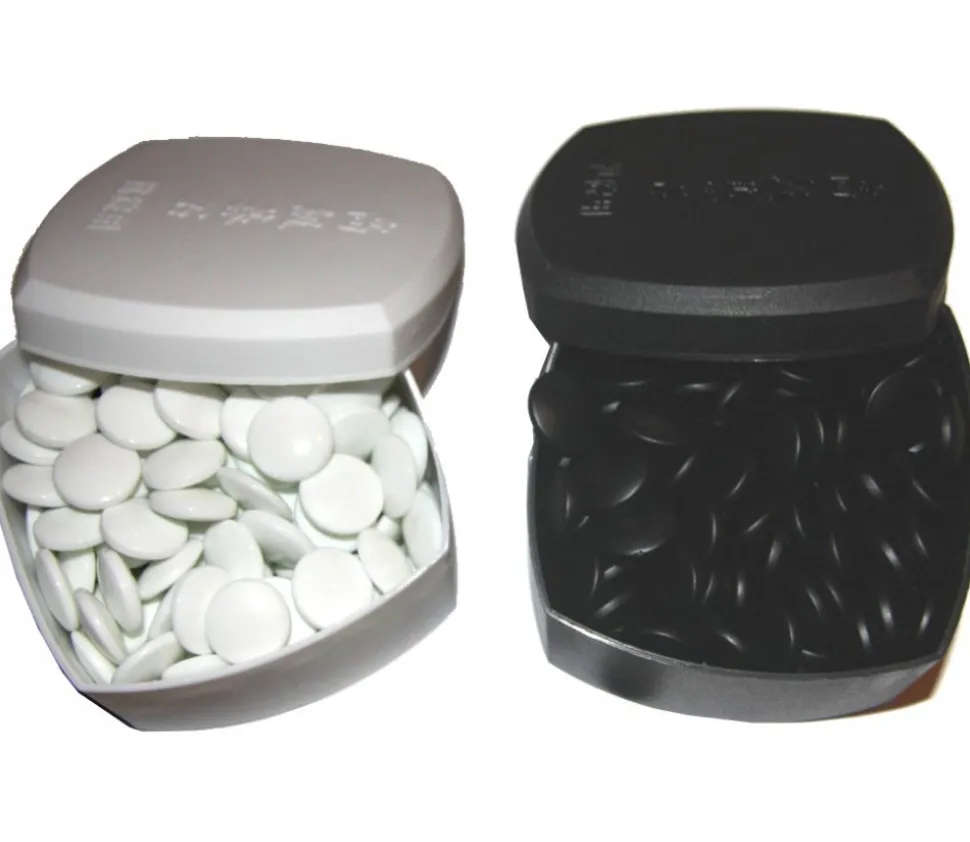 Pions pour jeu de Go de 20 mm de diamètre en blanc et noir. Les pierres sont en verre opaque et rondes.
