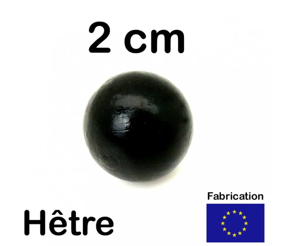 Boule 20 mm en bois teinté en noir. Idéal jeux et petites constructions en bois. Bille pleine de 2 cm de diamètre. Pièce en bois hêtre peinte en noir. Boule ronde sans trou en bois pour vos jeux, bricolage, arts plastiques ou réparations. Accessoire avec une jolie couleur pour remplacer vos balles de jeu d’adresse perdues ou créer de jeux ou des créations artistiques. Diamètre de 20 mm