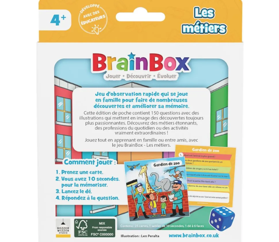 BrainBox pocket les métiers. Jeu d’observation et de mémoire. Jeu familial rapide pour apprendre et découvrir avec les enfants différents métiers. Une édition de poche facile à emmener partout, parfait pour les vacances. Version de 150 questions avec un sablier pour limiter le temps. Pratique, vous pouvez faire une partie avec vos amis ou en famille au restaurant en attendant les plats, dans les transports en commun (train, bus…)