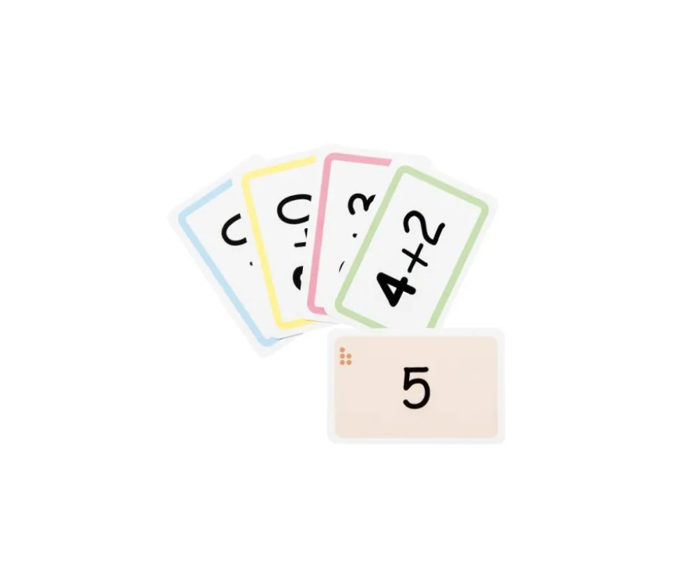 Toutes les cartes du jeu sont faites de la même manière : l’opération au recto et le résultat au verso. (recto : 3 + 4 et verso : 7)