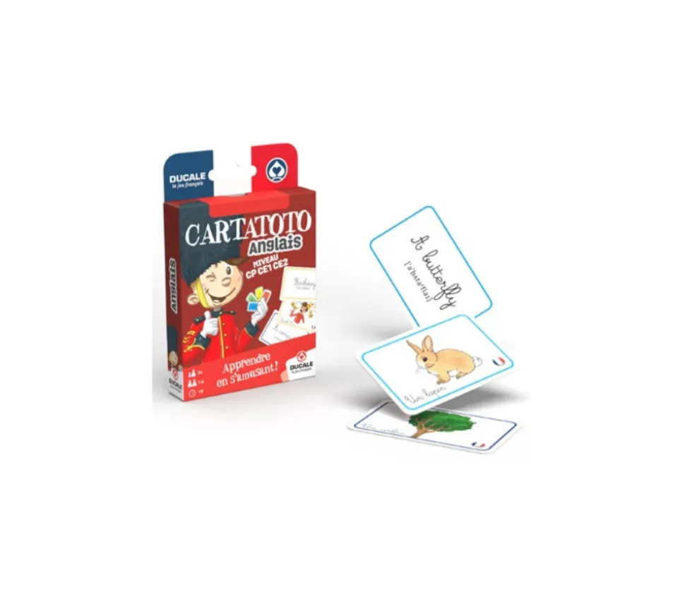 CARTATOTO anglais : 110 cartes de jeux pour apprendre le vocabulaire anglais plus facilement. Cartatoto vous propose de multiples règles du jeux pour vous adapter au niveau et à l’apprentissage souhaité (environ 5 mini jeux à découvrir : rapida mot, jeu des 7 familles, interrogation, mémo, imagination).