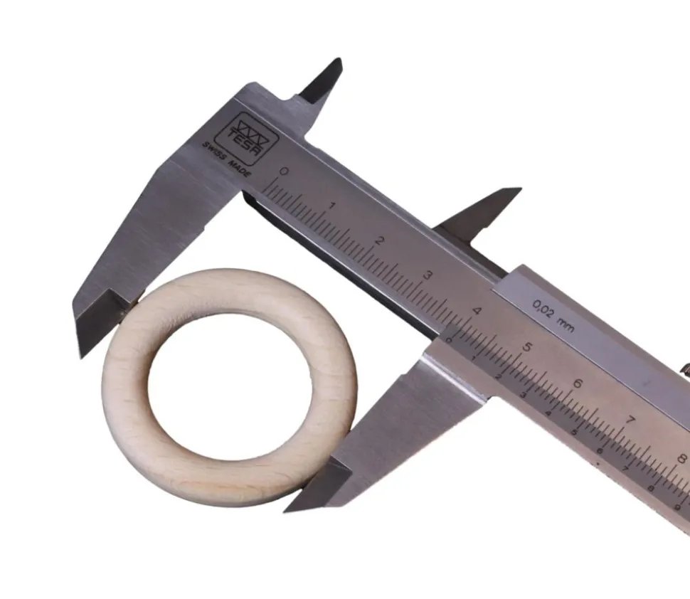 Le diamètre des anneaux en bois est de : 4 cm à l’extérieur (diamètre intérieur de 2.5 cm). Épaisseur de 7 mm