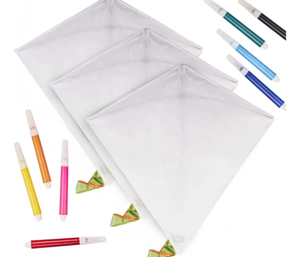Cerf-volant blanc à personnaliser avec 8 feutres de couleur. Jeu pour les enfants qui veulent jouer aux apprentis pilotes avec un cerf-volant qu’ils auront décoré. Commencez par assembler le cerf-volant, puis le colorier et le décorer. Vous êtes prêt pour le 1er vol !