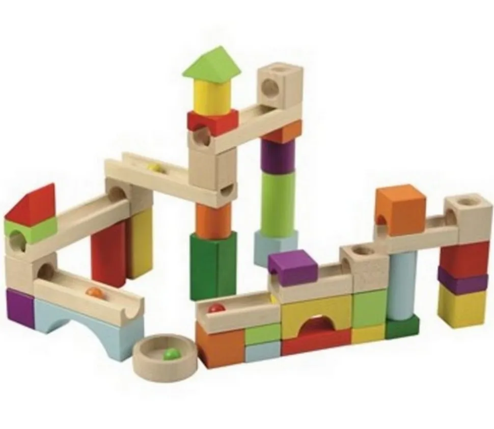 Jeu en bois de circuit à billes avec 58 blocs de construction en couleurs (bleu clair, vert, vert clair, rouge, jaune, orange, violet et naturel) comprenant: