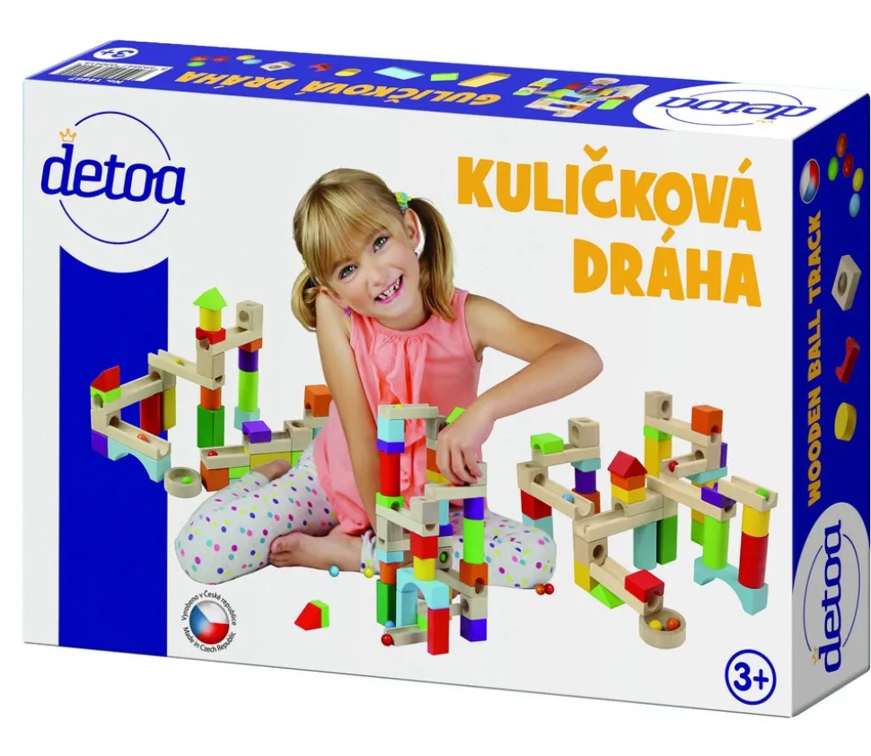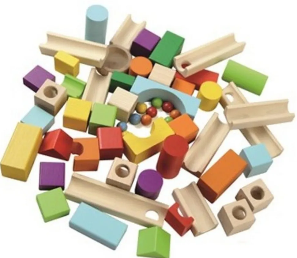 Jouet circuit de billes en bois qui permet de nombreuses possibilités. Construisez votre parcours et puis laissez les billes glisser à travers les cubes, sous un tunnel…