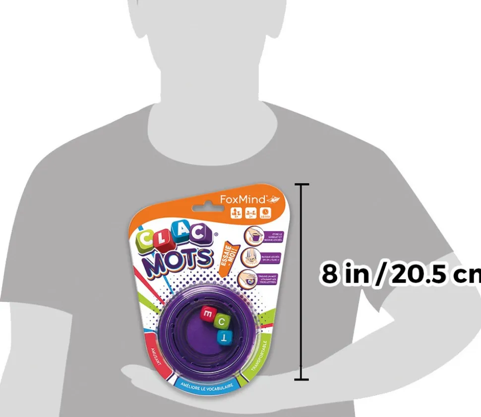 Un jeu de mots et de lettres rapide et amusant. Un shaker pliant avec des dés lettres à l’intérieur. Le premier joueur prend le shaker contant les dés, le soulève pour le déplier, le secoue puis le replie en faisant clac. Le joueur doit alors trouver un mot incluant les 3 lettres.