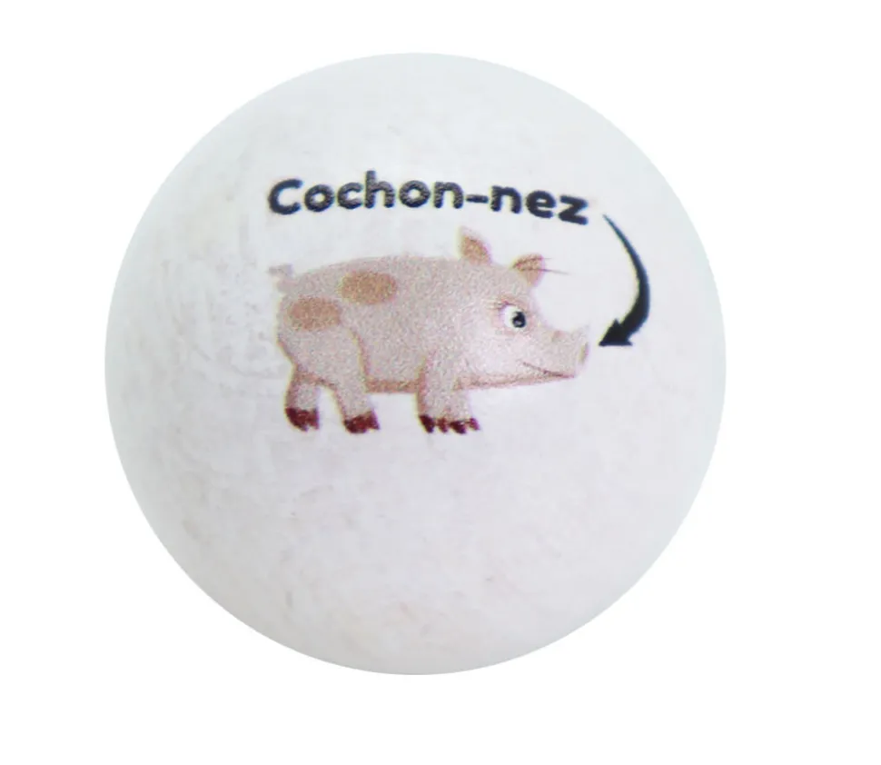 Boules en hêtre de 3 cm de diamètre blanc avec impression en couleur d’une image d’un petit cochon rose et du texte : « cochon-nez ».