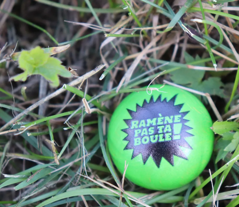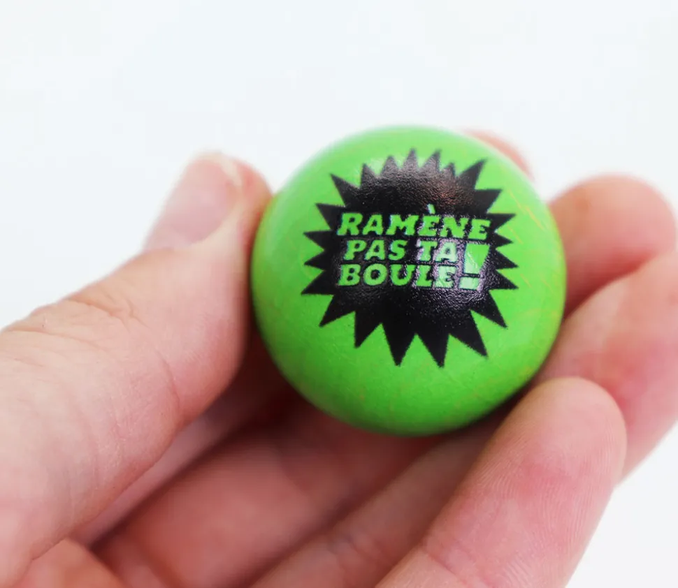Cochonnet personnalisé avec texte rigolo : « ramène ta boule » sur une face.