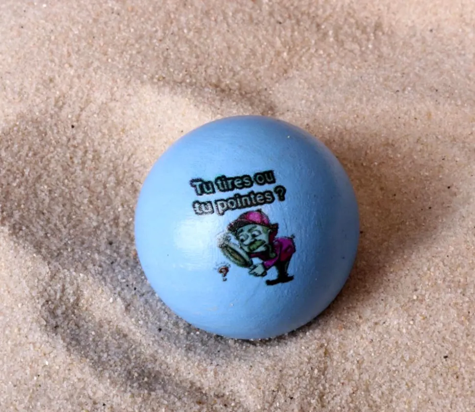Cochonnet fun pour les joueurs de pétanque. Un cochonnet avec une impression amusante : un personnage dessiné et le texte : « Tu tires ou tu pointes ! ».