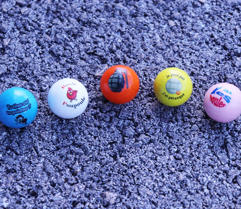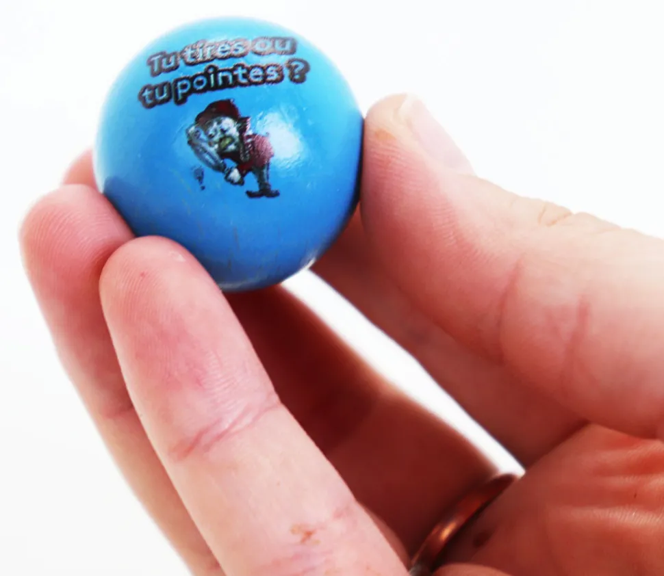 Boules en hêtre de 3 cm de diamètre teinté en bleu avec impression d’un petite personnage et le texte « tu tires ou tu pointes ? »