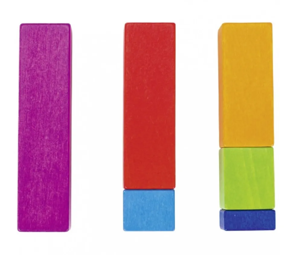 Matériel en bois de couleur pastel avec des bâtonnets cuisenaire en bois de 1 cm à 10 cm épais de 2.5 cm de largeur pour faciliter la manipulation par les enfants.
