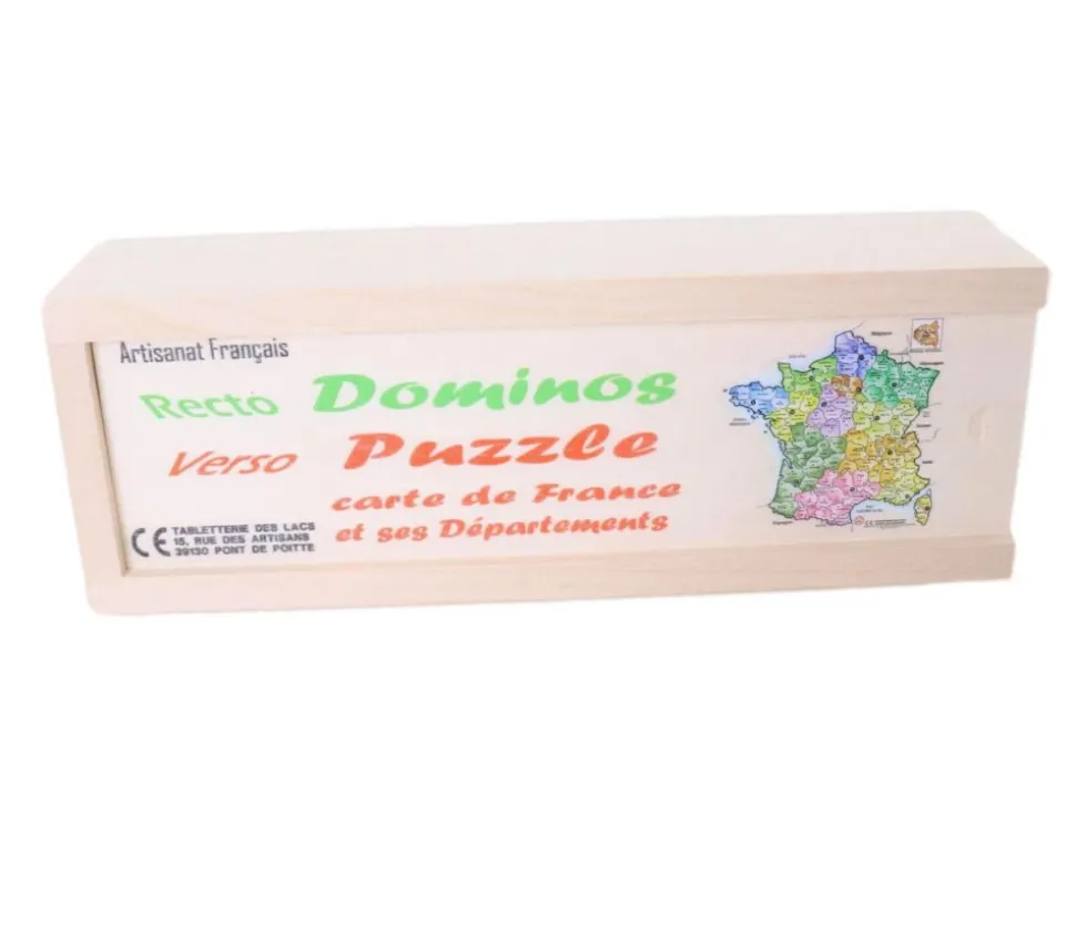Coffret en bois : 2 jeux en 1. Recto jeu de dominos traditionnel et verso puzzle de la carte de France avec les régions et départements.