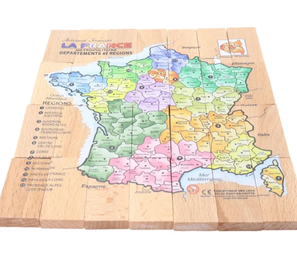Puzzle Carte de France colorée avec les nouvelles régions, les départements, leur numéro et les préfectures (28 pièces rectangulaires).