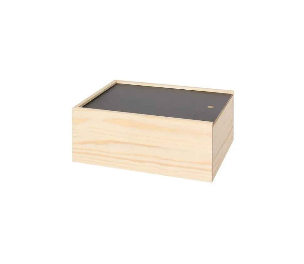 Bois naturel. Couvercle ardoise sur lequel vous pouvez écrire à la craie. Boite en bois avec un couvercle coulissant pour ranger vos accessoires de jeux ou matériel pédagogique. Livré vide.