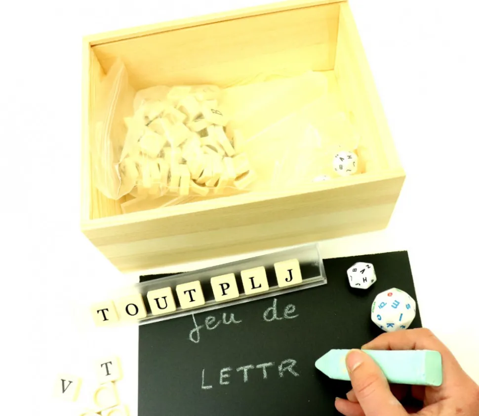 Couvercle ardoise sur lequel vous pouvez écrire à la craie. Boite en bois avec un couvercle coulissant pour ranger vos accessoires de jeux ou matériel pédagogique. Livré vide.